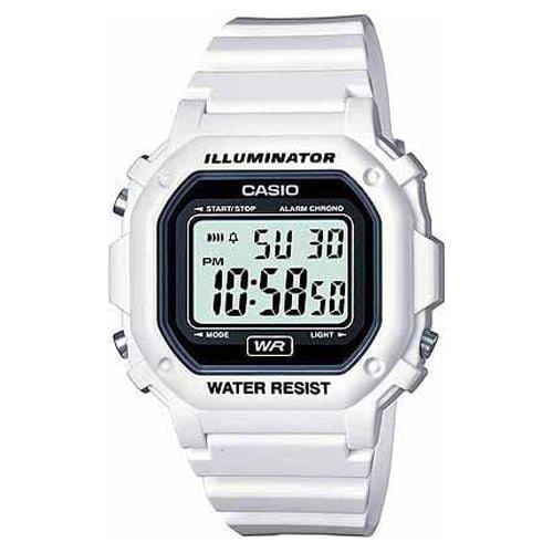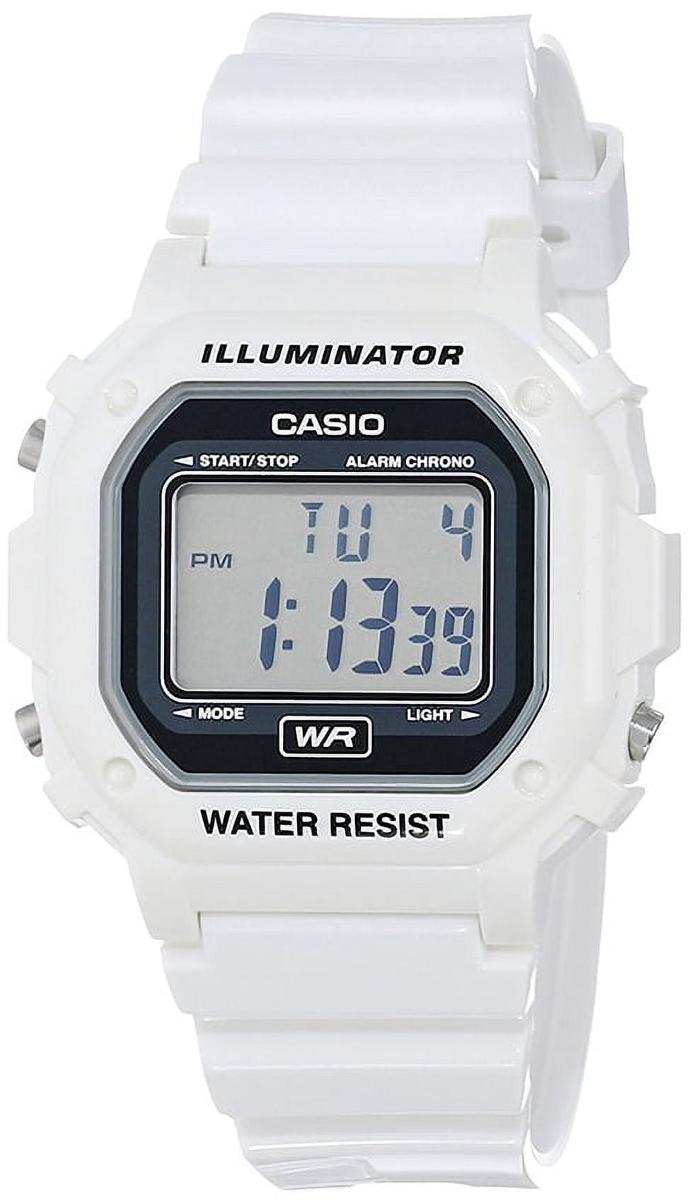 This Casio unisex watch features a round gray dial and digital display. All of these are framed in a white resin case. It also offers a white resin strap secured with buckle, quartz movement, day and date indicator, and water resistance up to 30meters/99feet.