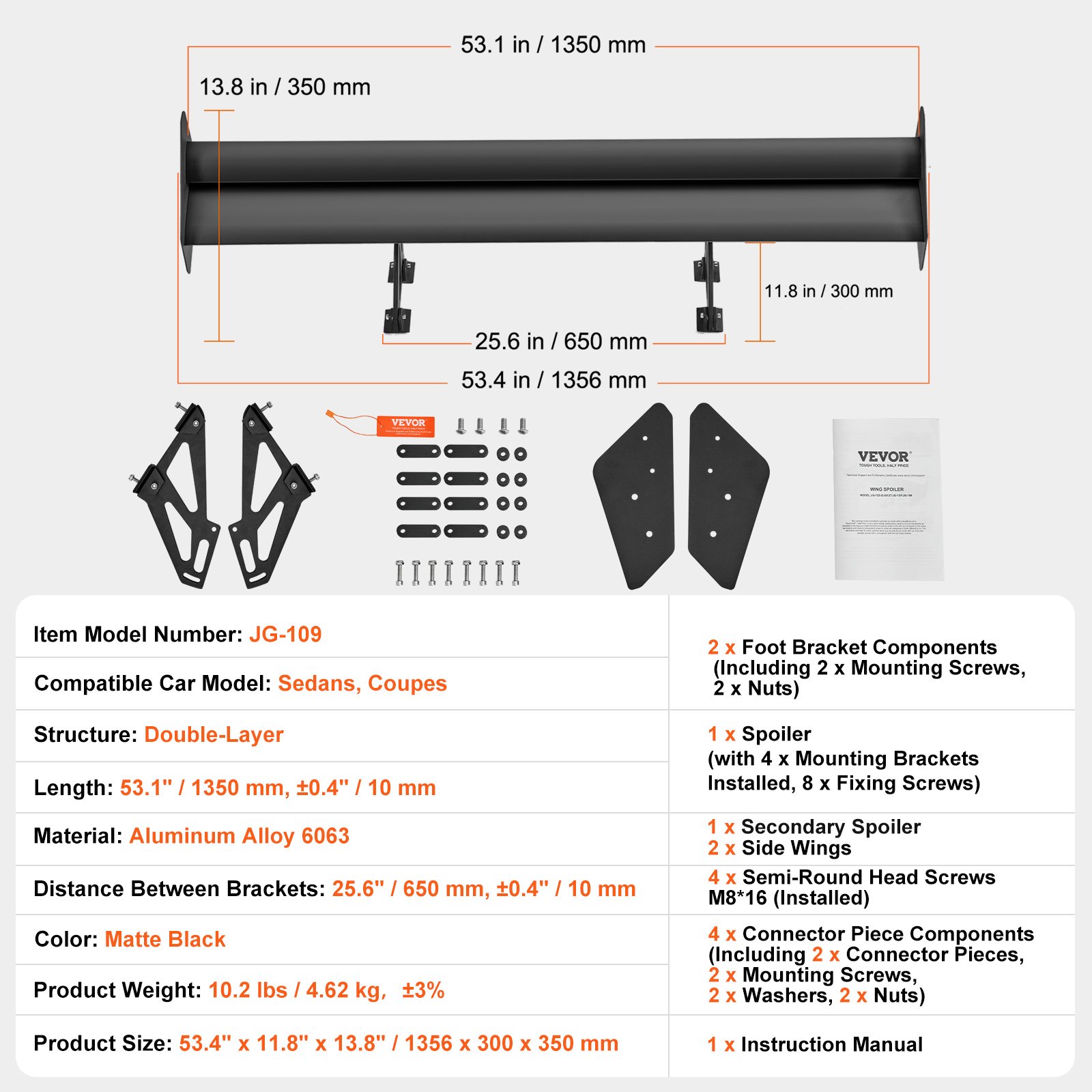 VEVOR GT Wing Autospoiler, 53,1 Zoll Universalspoiler mit Doppeldeck, verstellbares leichtes Aluminium, Auto Heckspoilerflügel, Racing Spoiler BGW/JDM Drift Schwarz