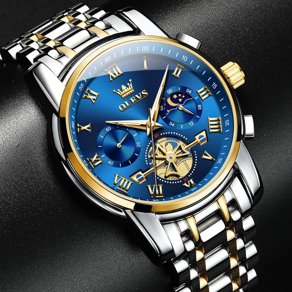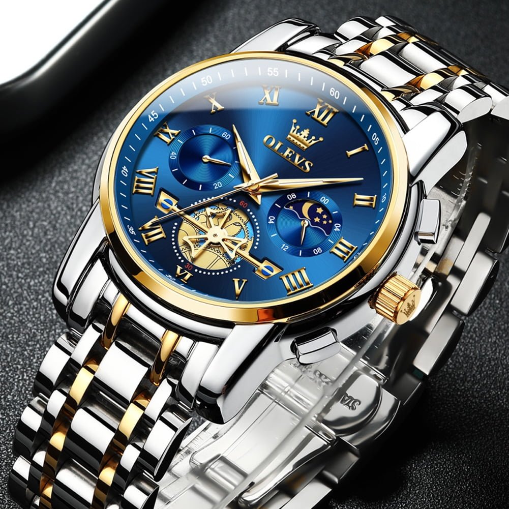 ⌚Multifunctional Men Watch:Male watch a chronograph with three sub-dials, showing 60 seconds, 60 minutes, moon phase, and a calendar window display on the right. The design style is simple, business, classic and generous.