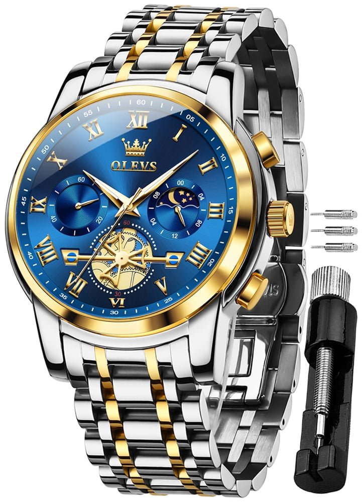 Olevs OLS2859 men’s Chronograph watch blue dial is 41 mm in diameter, 11 mm in thickness, 127g weight, water-resistant to 30 meters, scratch resistant mirror, luminous hands, date window, 19 cm watch band fits up to 7.4-inch wrist circumference, and the tool for adjusting the band length and manual is included in the package.