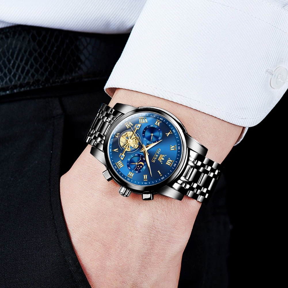 ⌚Multifunctional Men Watch:Male watch a chronograph with three sub-dials, showing 60 seconds, 60 minutes, moon phase, and a calendar window display on the right. The design style is simple, business, classic and generous.
