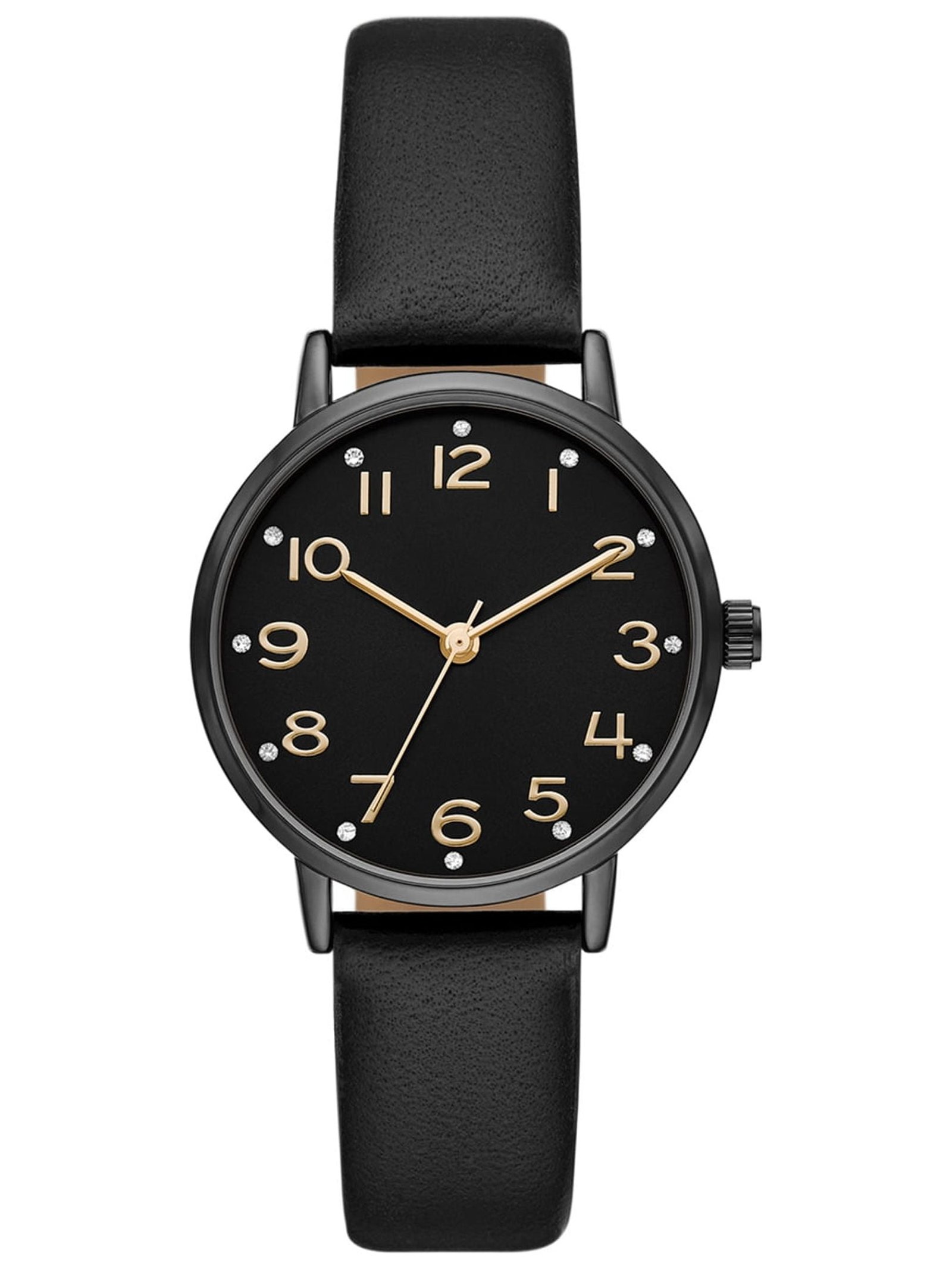 Smoky black and gold tones are both favorites of ours. Always a tasteful combination, we have used these two favorites when designing this Time and Tru Gunmetal Crystal Accent Watch. The smooth black faux leather band is matched with a smoky gunmetal case and black dial. We then used elegant gold-tone hands and hour markers, accented with sparkling crystals. Exclusively at Walmart.
